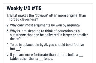 Weekly I/O #115: Originality is Being Obvious, Can't Win by Arguing, Education is not a substance, Effective but Unpredictable, Longer Table not Taller…