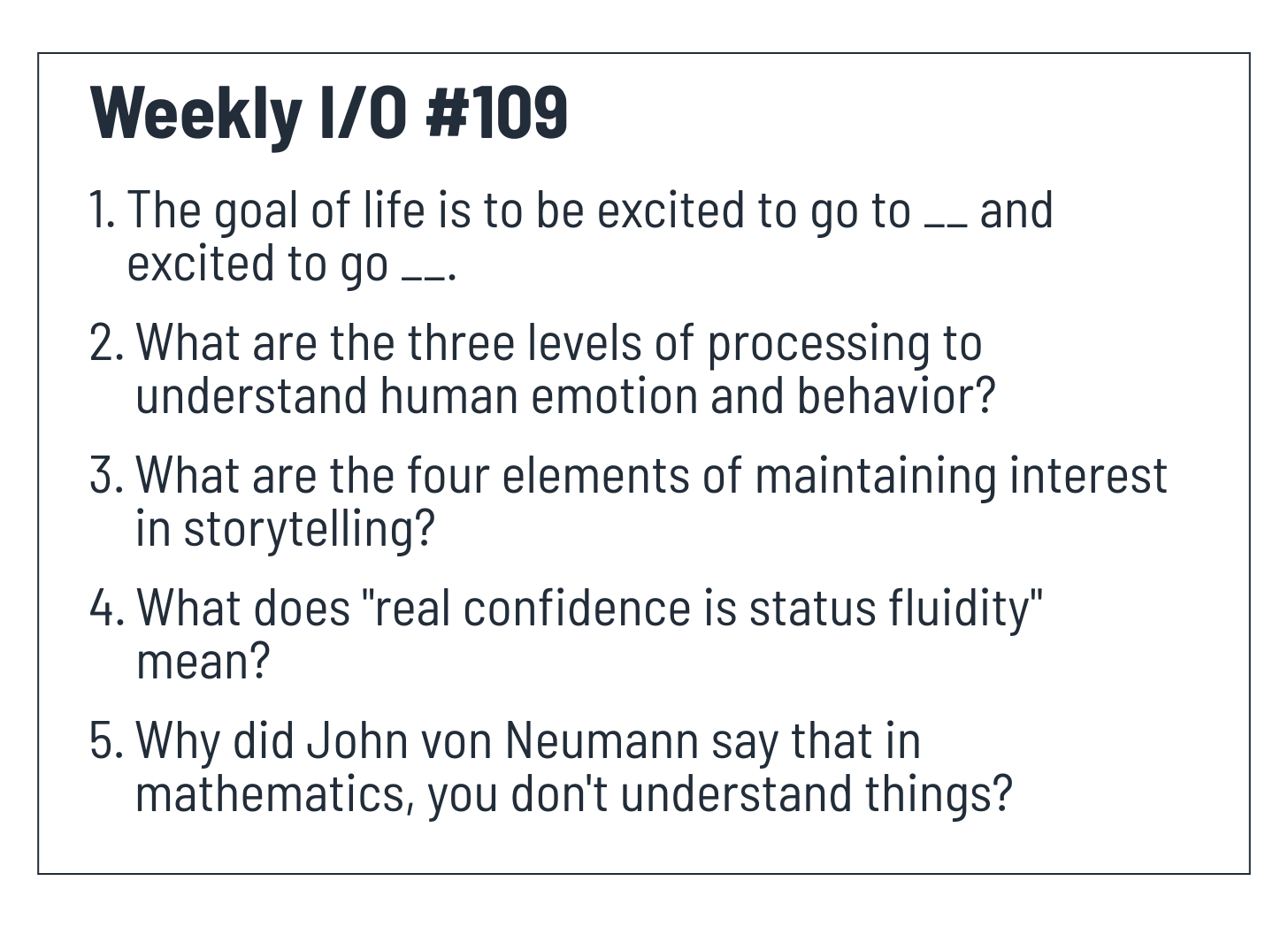 Weekly I/O #109: Excited about Work and Home, Three Processing Levels of Emotion and Behavior, Four Elements of Storytelling, Confidence is Status Fluidity, Get Used to Don't Understand