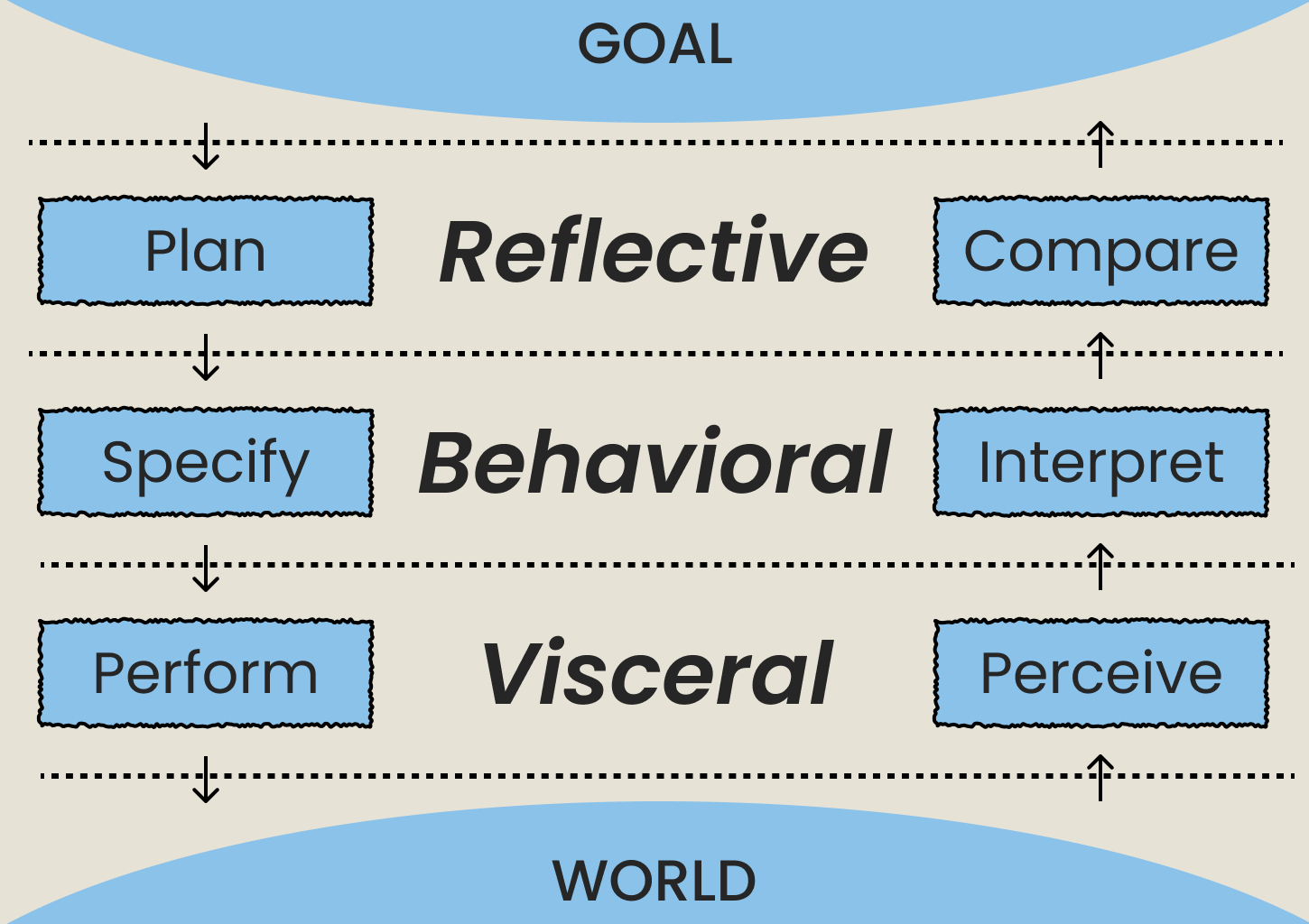 You can also combine this with the Seven Stages of the Action Cycle. "Plan and Compare" is at the reflective level, "Specify and Interpret" is at the behavioral level, and "Perform and Perceive" is at the visceral level.