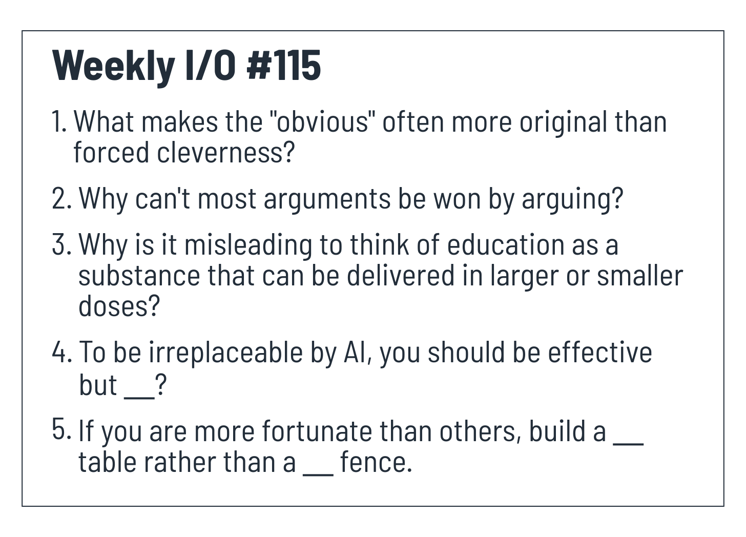 Weekly I/O #115: Originality is Being Obvious, Can't Win by Arguing, Education is not a substance, Effective but Unpredictable, Longer Table not Taller Fence