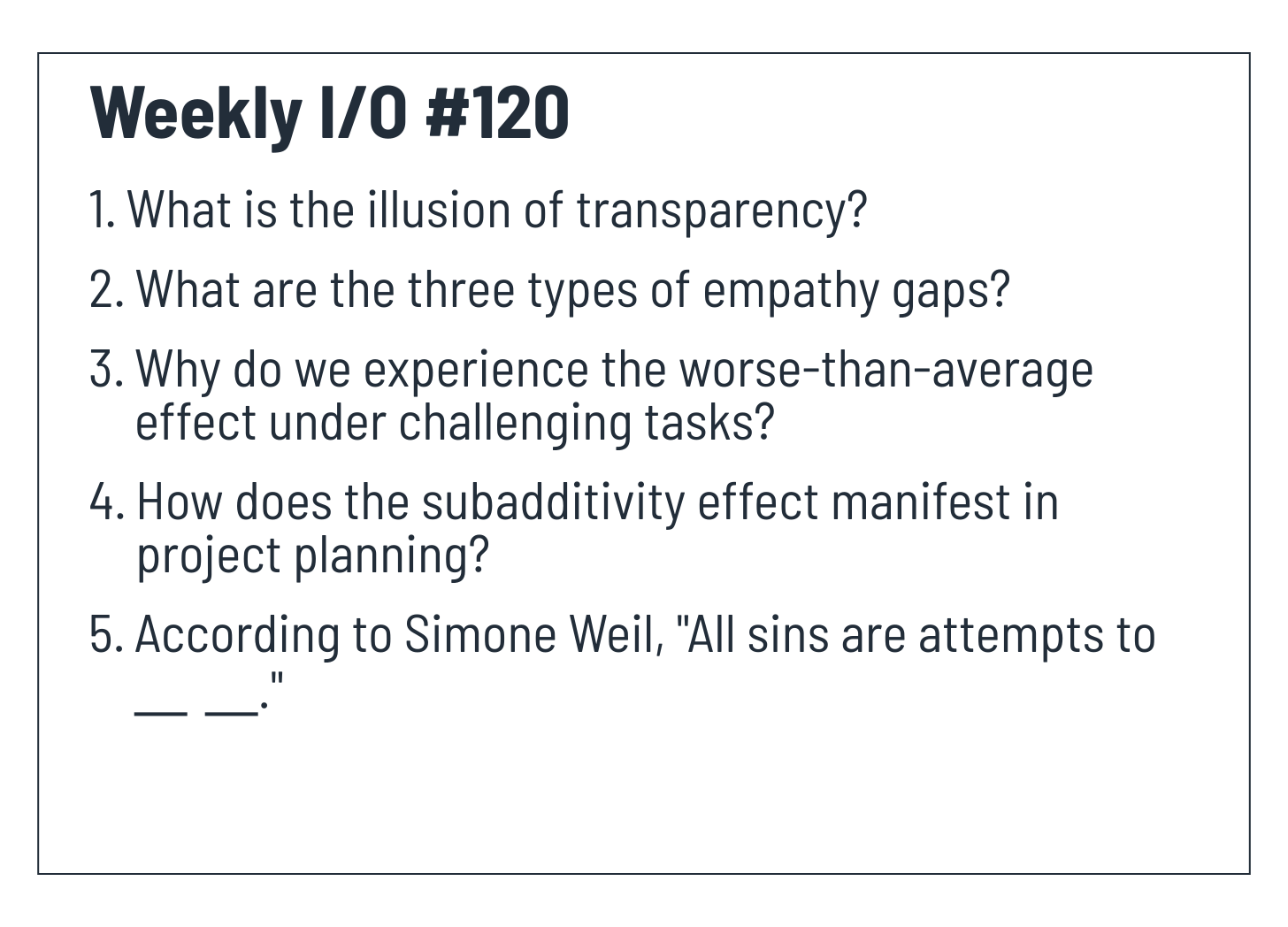Weekly I/O #120: Illusion of Transparency, Hot-Cold Empathy Gap, Worse-Than-Average Effect, Subadditivity Effect, Sins to Fill Void