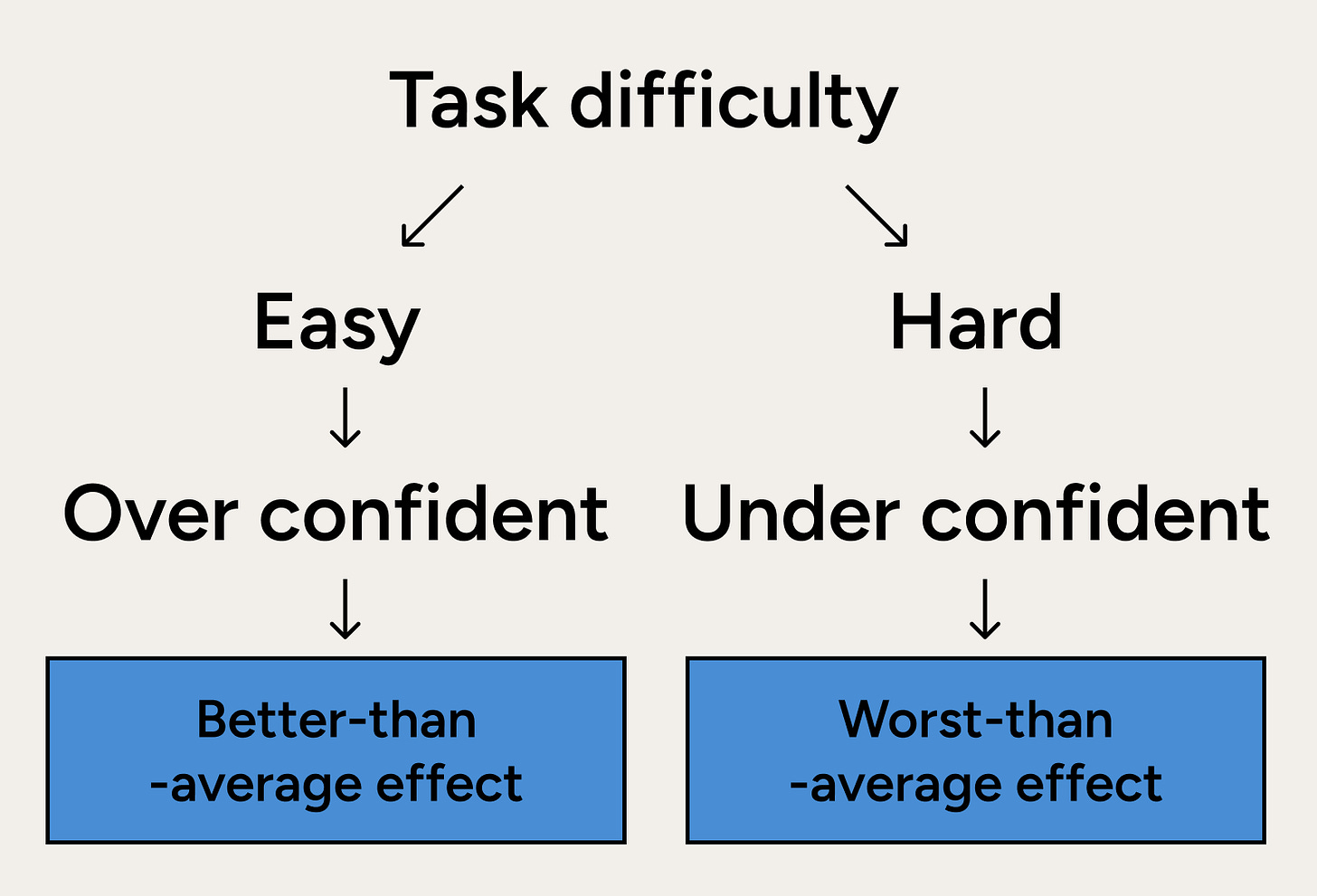 That’s the worst-than-average effect. We underestimate our abilities compared to others, especially in areas where we lack confidence. In other words, when a task is difficult, we assume we are worse than average, even if the task might be challenging for everyone.