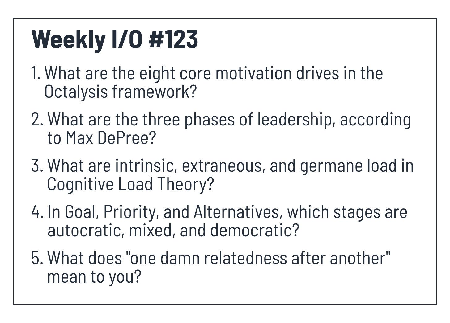 Weekly I/O #123: Octalysis Motivation Framework, Artful Leadership, Cognitive Load Theory, GPA Decision Styles, One Damn Relatedness After Another