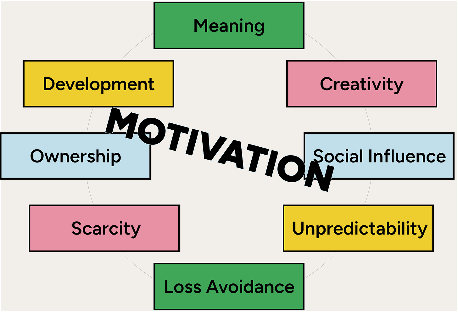 1. Motivation comes from eight core drives: Meaning, Development, Creativity, Ownership, Social influence, Scarcity, Unpredictability, and Loss Avoidance.
