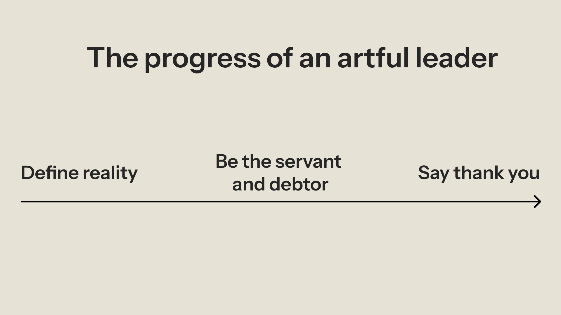 2. “The first responsibility of a leader is to define reality. The last is to say thank you. In between the two, the leader must become a servant and a debtor. That sums up the progress of an artful leader.” ― Max DePree