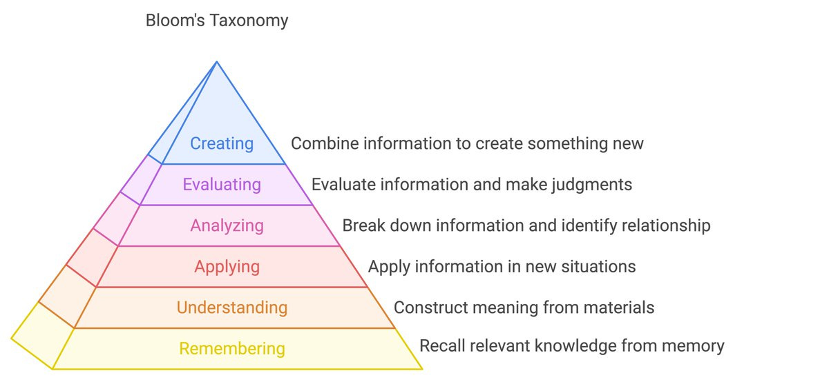 1. Bloom's Taxonomy: Our learning objectives can be classified as a hierarchy of remember, understand, apply, analyze, evaluate, and create.